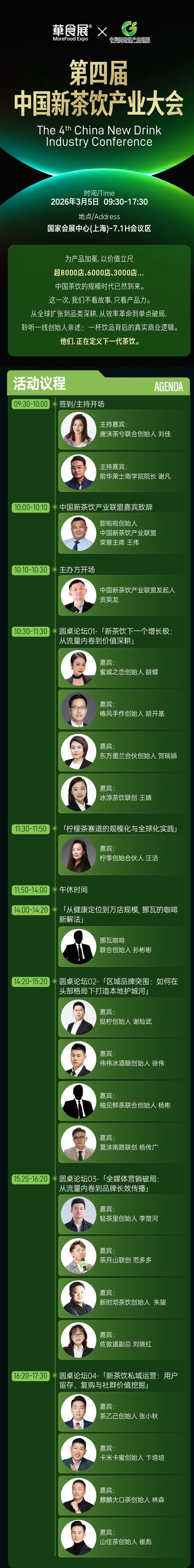 由华墨集团·上海华好会展有限公司主办的2026华食展·上海,将于3月5日-7日在上海国家会展中心隆重举行。本届展会,首次联合中国新茶饮产业联盟,于7.1馆共同推出华食饮品菜单展,同期重磅打造2026中国新茶饮节,举办第四届中国新茶饮产业大会、第九届中国新餐饮产业大会、第三届“餐+饮”高峰论坛,现场大咖云集,将组成 “思想高地” 矩阵。届时,100 + 品牌创始人、3000+资深从业者齐聚,聚焦“内卷破局”、“模式进化”、“流量深耕”、“餐饮融合新范式” 等核心议题,拆解真实案例、碰撞实战经验。