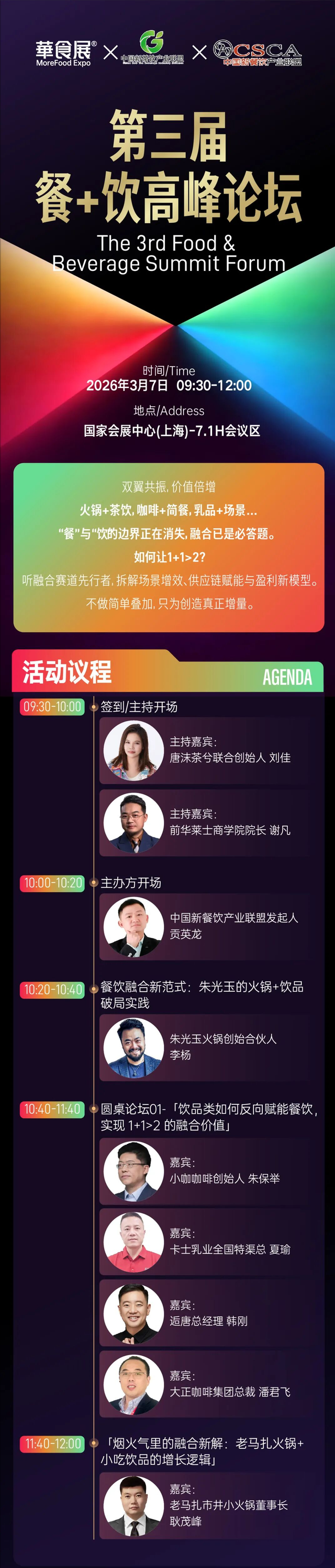 同期重磅打造2026中国新茶饮节,举办第四届中国新茶饮产业大会、第九届中国新餐饮产业大会、第三届“餐+饮”高峰论坛,现场大咖云集,将组成 “思想高地” 矩阵。届时,100 + 品牌创始人、3000+资深从业者齐聚,聚焦“内卷破局”、“模式进化”、“流量深耕”、“餐饮融合新范式” 等核心议题,拆解真实案例、碰撞实战经验。